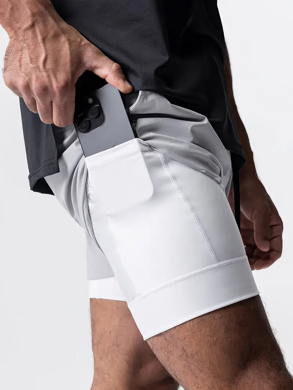• Tennis style above knee shorts. With Hidden Phone Pocket